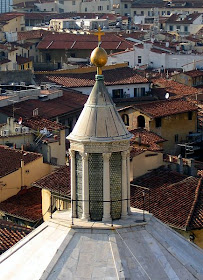 This building became known for its function and grandeur that reflects the importance of baptism for Christians. Additionally Baptistry became famous for the three sets of artistically important bronze doors with carvings. Doors by Andrea Pisano south and north and east doors by Lorenzo Ghiberti. The couple, dubbed by the east door of Michelangelo "Gates of Paradise". And an octagonal lantern was added to the pavilion roof around 1150. In the corner, under a roof, there is a giant lion's head with a human head under their claws. The exterior is also decorated with a number of significant artistic sculpture by Andrea Sansovino (above the Gate of Heaven), Giovan Francesco Rustici, Vincenzo Danti (above the south door) and others.